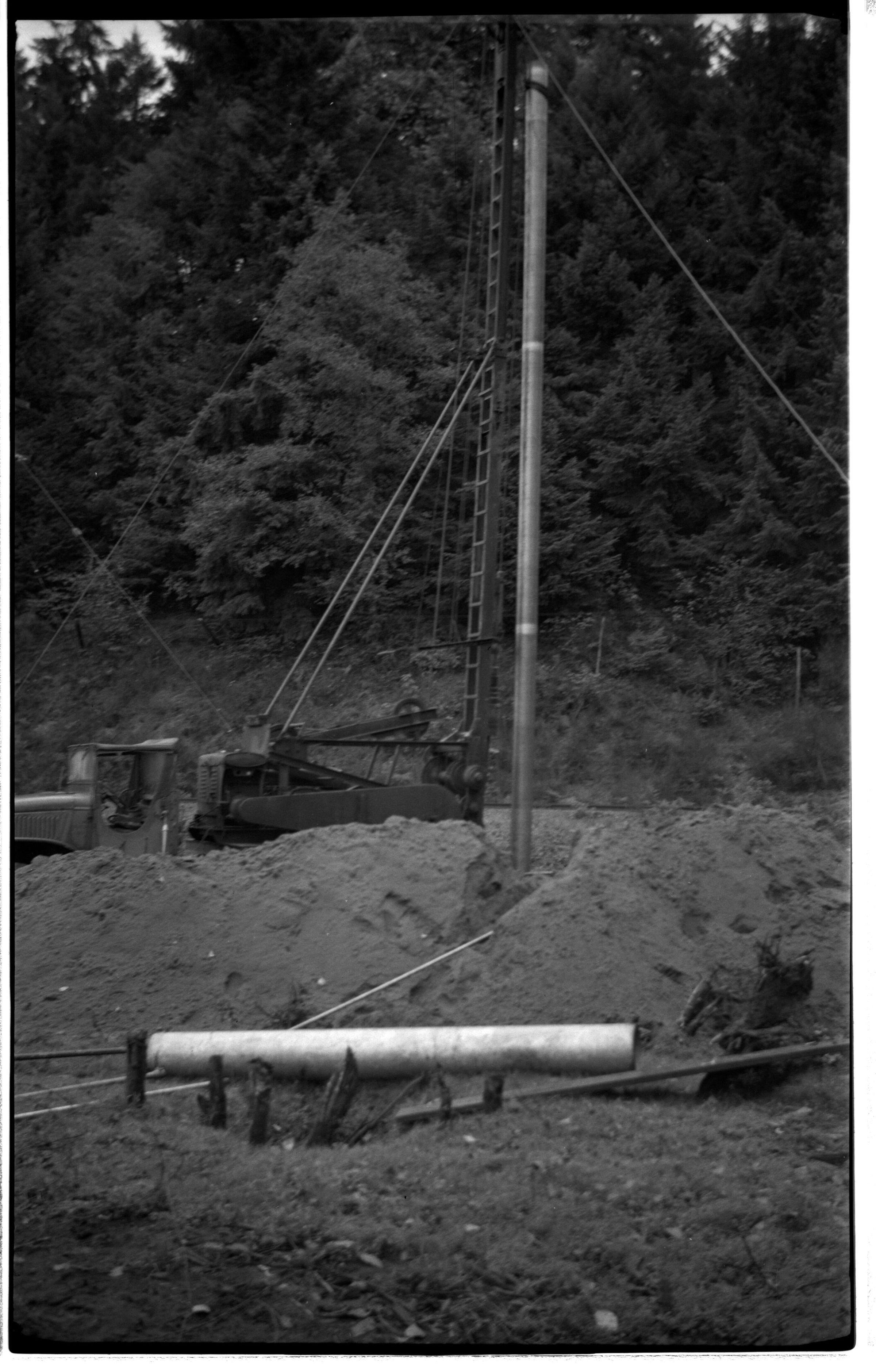 Negative, sheet film. 3.5 x 2 b&w. Drilling a well.