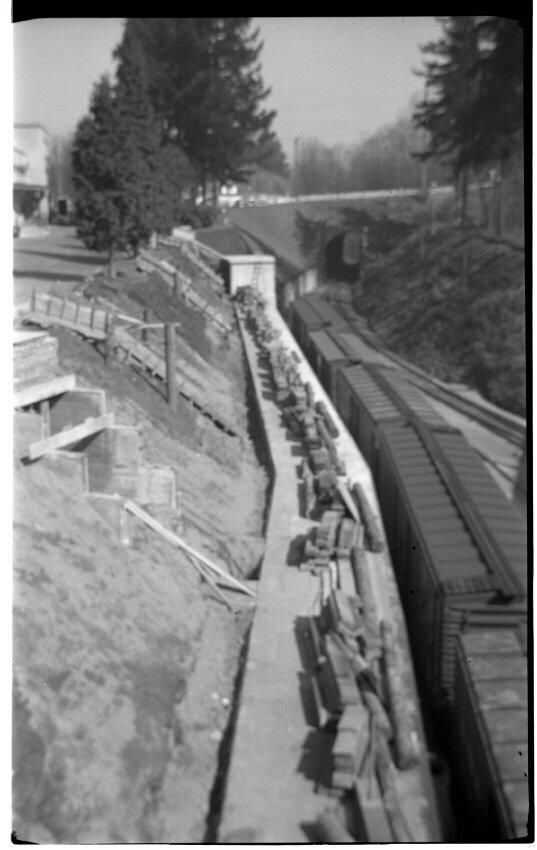 Negative, sheet film. 3.5 x 2 b&w. Railcars and siding along east side of Olympia brewery.