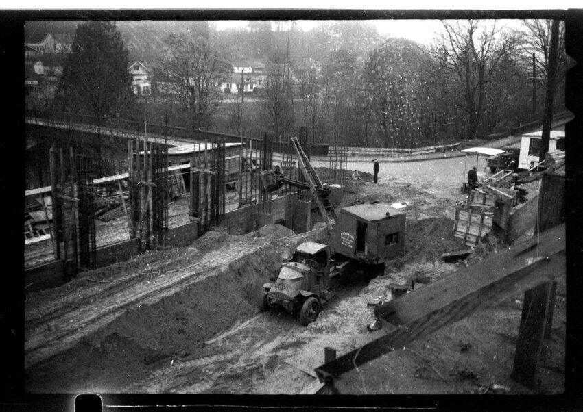 Negative, sheet film. 1 x 1.6 b&w. Building M Cellar at Olympia Brewing Company. Boston Street Bridge in background.