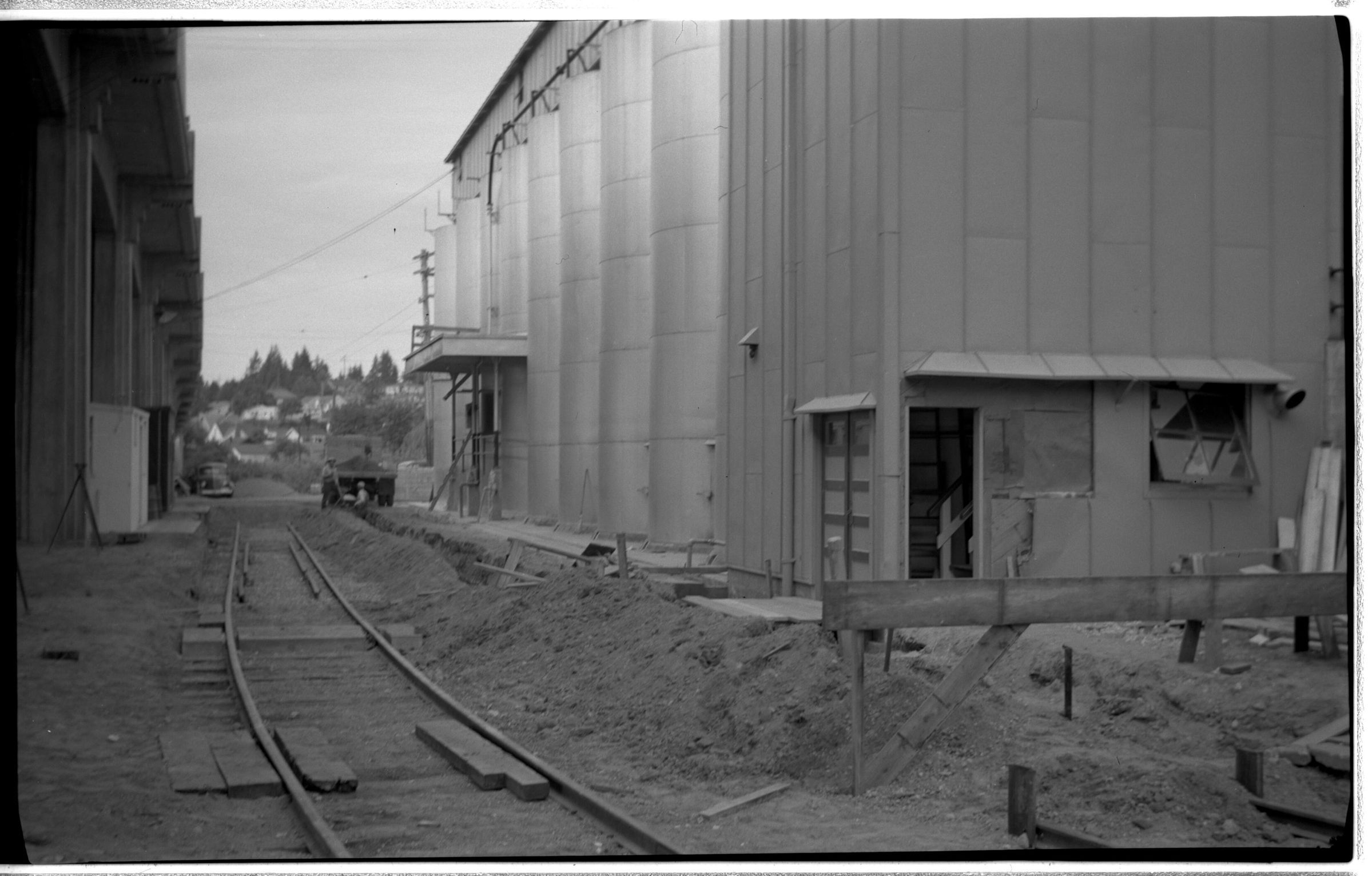 Negative, sheet film. 2 x 3.5 b&w. Base of malt tower in right foreground, looking south. Underside of Carlyon bridge at left.