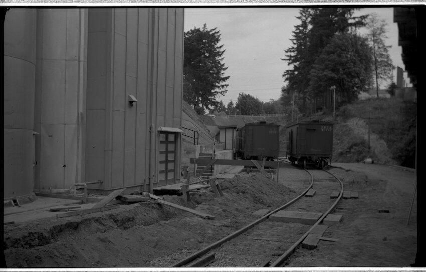 Negative, sheet film. 2 x 3.5 b&w. Base of malt tower on left. Railroad tunnel under Custer is hidden behind rail cars. Looking north.