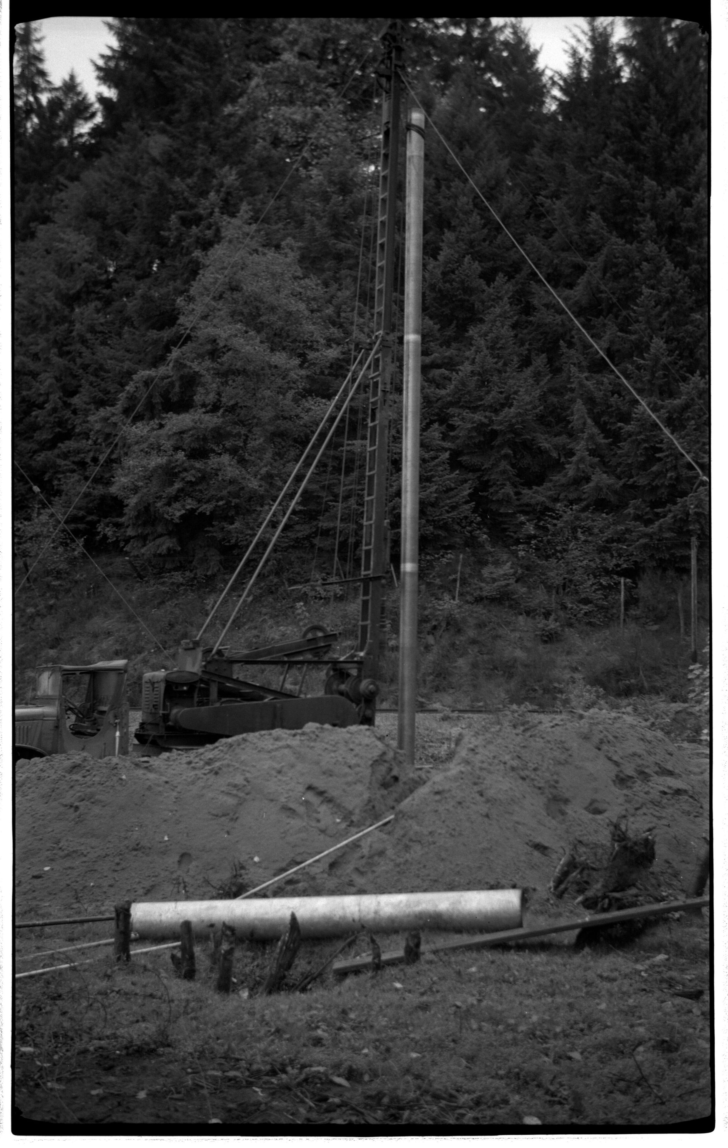 Negative, sheet film. 3.5 x 2 b&w. Drilling a well.