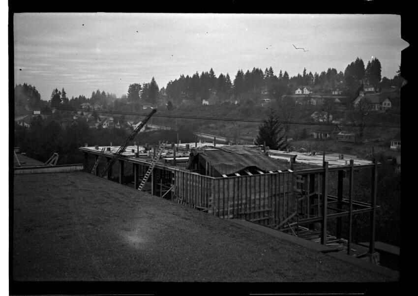 Negative, sheet film. 1 x 1.6 b&w. Building M Cellar at Olympia Brewing Company.