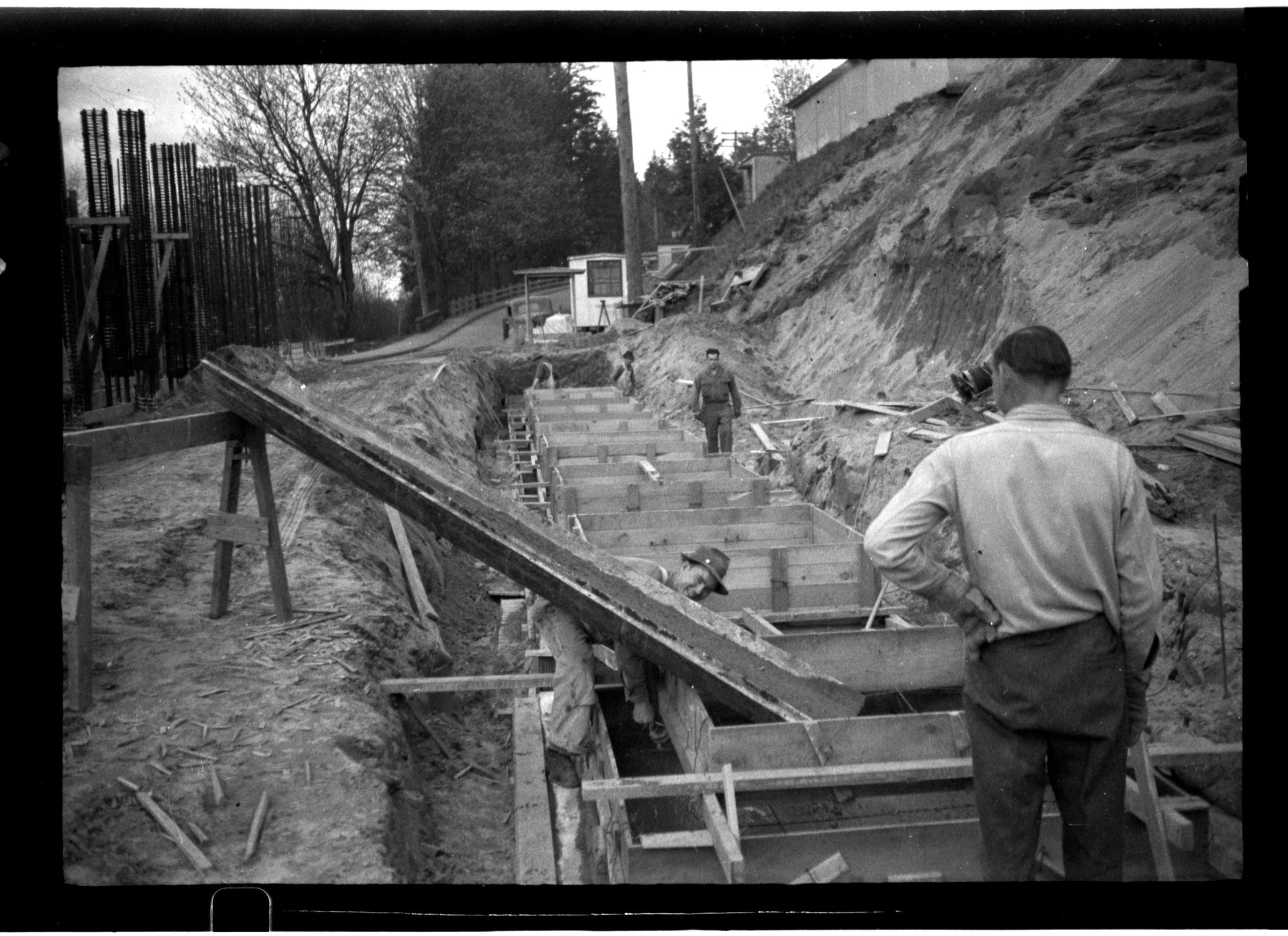 Negative, sheet film. 1 x 1.6 b&w. Building M Cellar at Olympia Brewing Company.