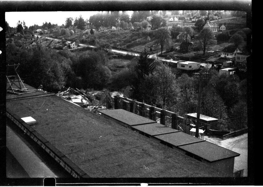 Negative, sheet film. 1 x 1.6 b&w. Building M Cellar at Olympia Brewing Company.