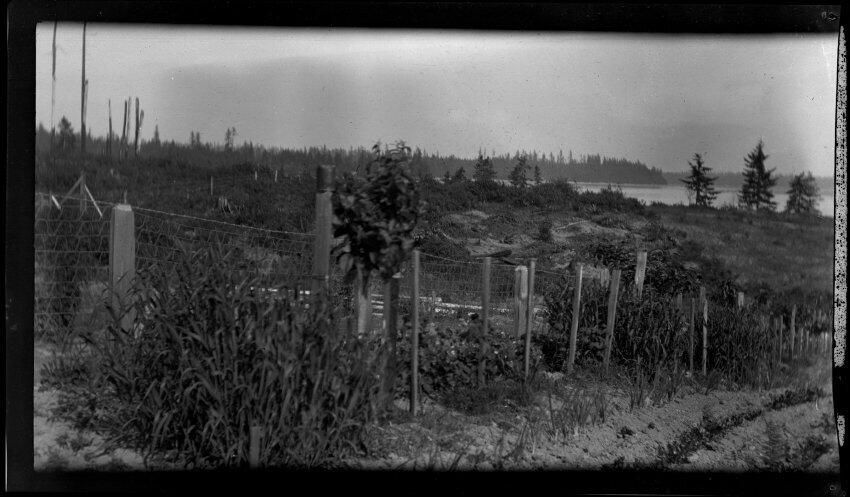 Negative, sheet film. 3 x 5 b&w. View of fence and partially cleared land, with saltwater in distance.