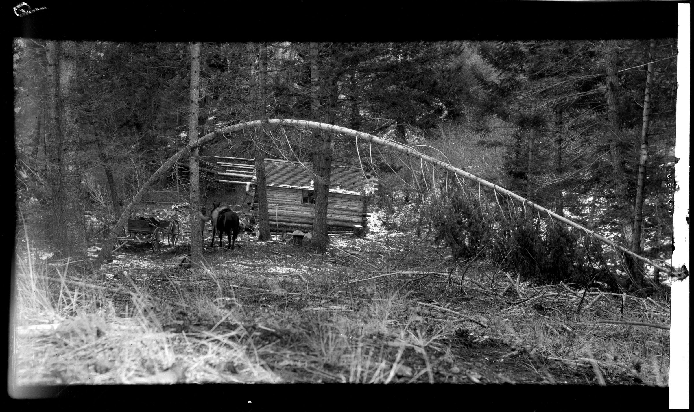 Negative, sheet film. 3 x 5 b&w. Log cabin, horse, wagon in unknown location.