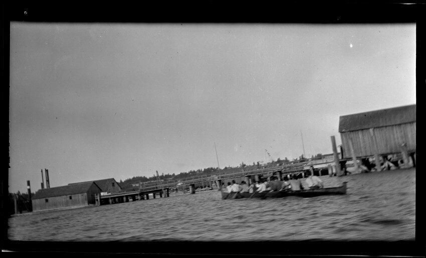 Negative, sheet film. 3 x 5 b&w. Men paddling large Native American-style dugout canoe. Wooden docks and buildings in background. WSHS has photos from same series and describes event: "Photograph of two long canoes racing in the Deschutes Estuary, Olympia, WA, Thurston County, on July 4, 1905. According to accompanying narrative, we are looking toward downtown Olympia from the Fourth Avenue Bridge. Two canoes are racing, each one with eleven paddlers. A small steamer is observing the race. In the distance we can see the wooded Capitol Hill and the railroad bridge across the Deschutes Estuary. We can just make out the old Territorial Capitol hidden among the trees, St. Peter's Hospital, Providence Academy, and the steeple of First Congregational Church. A beach is along the bank, with pilings extending into the estuary." See WSHS photo C1949.1276.1... for similar photos.Name/Title