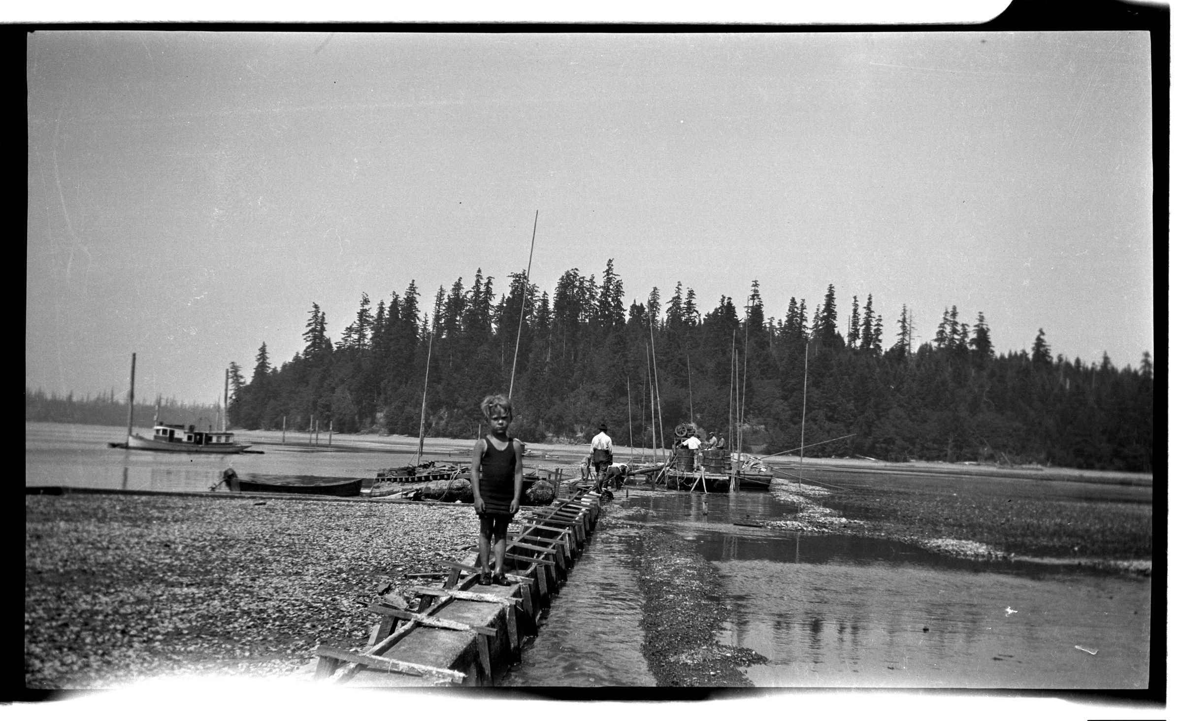 Negative, sheet film. 2.5 x 4 b&w. Oyster farming somewhere on south Puget Sound. Child is probably Peter G. Schmidt Jr.