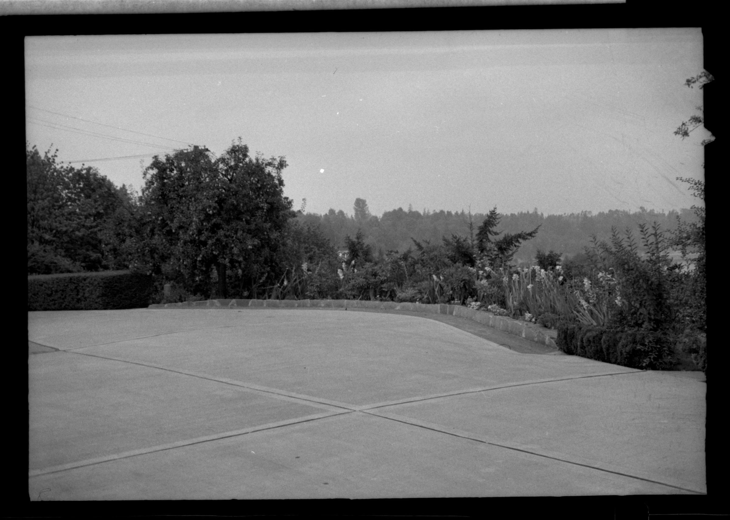 Negative, sheet film. 1 x 1.5 b&w. Patio/parking area in back yard of Schmidt House. Looking northwest.