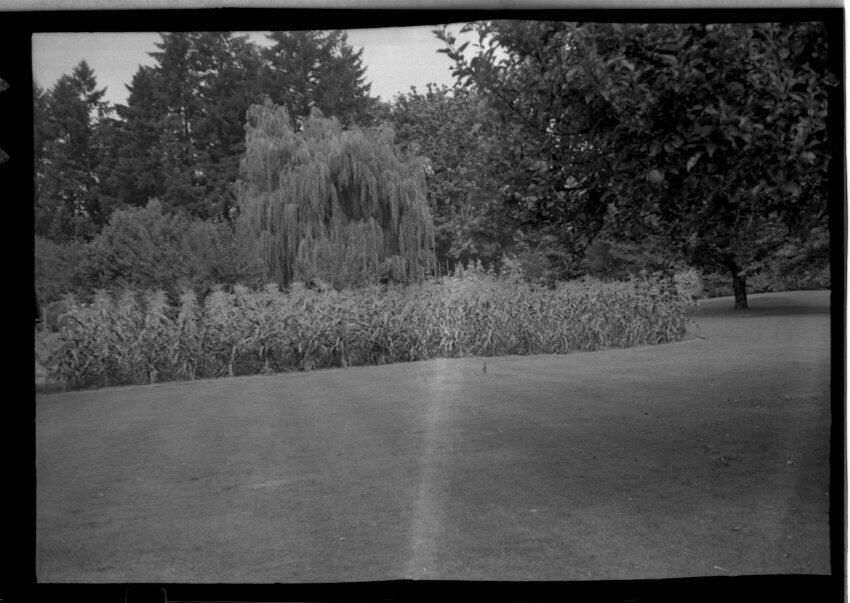Negative, sheet film. 1 x 1.5 b&w. Back yard, corn patch at Schmidt House.