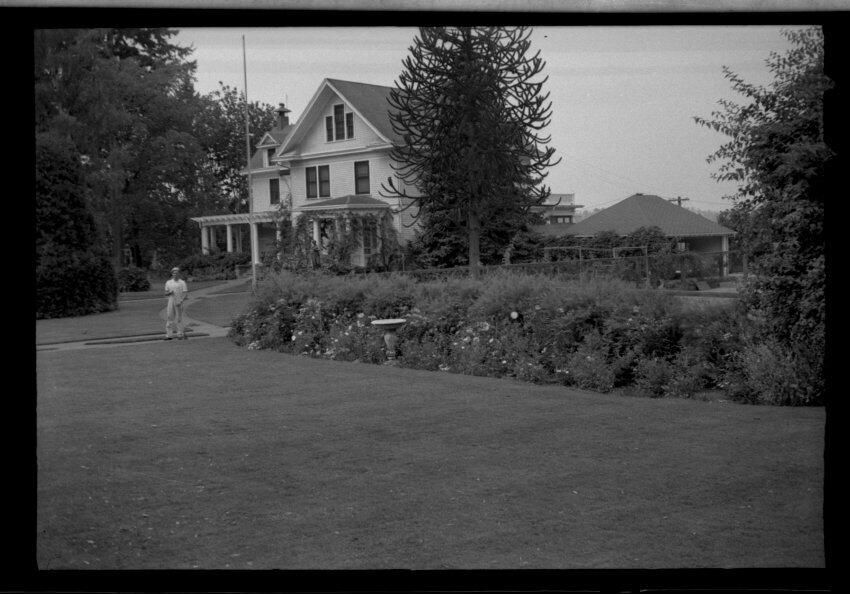Negative, sheet film. 1 x 1.5 b&w. Schmidt House, looking northwest. Man may be Eddie Nyland, longtime gardener/caretaker.
