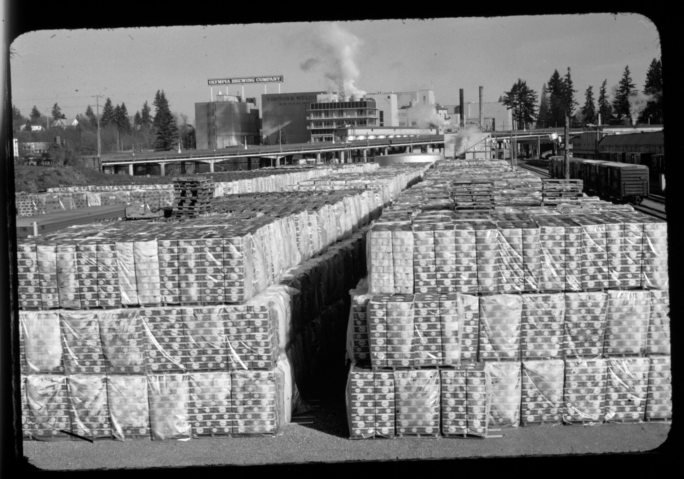 Negative, sheet film. 2.5 x 4 b&w. Bottles stacked in "our backyard." Recycling area at Olympia Brewing Company.