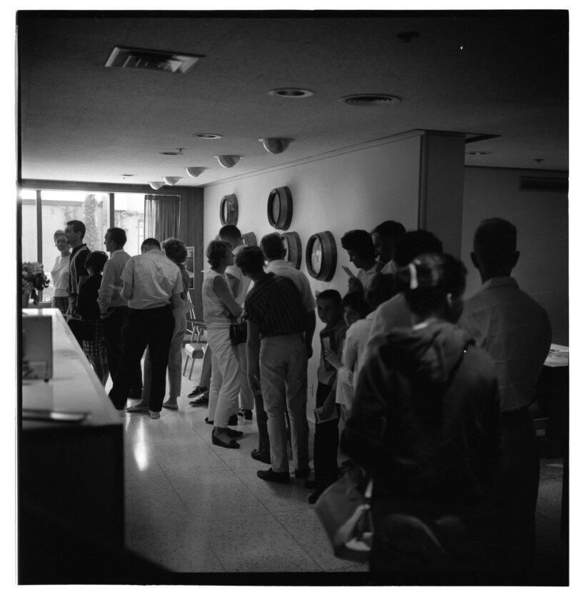 Negative, sheet film. 2 x 2 b&w. No. 914. OB Corp TV. Visitors at Olympia brewery. No ID on people