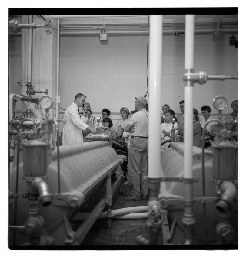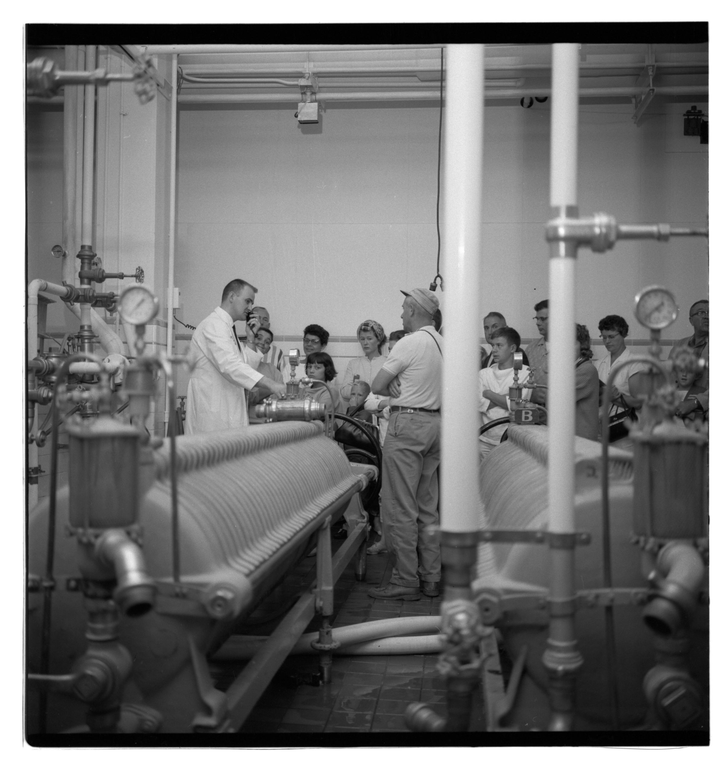 Negative, sheet film. 2 x 2 b&w. No. 914. OB Corp TV. Tourists at Olympia brewery. No ID on people