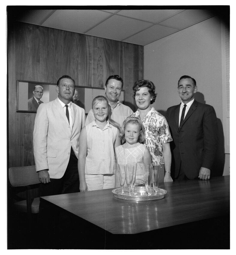 Negative, sheet film. 2 x 2 b&w. No. 914. OB Corp TV. Millionth visitor at Olympia brewery, 12:58 p.m. Donna, Lori, Eric and Lila Nelson. Bink Schmidt at right. No ID on other
