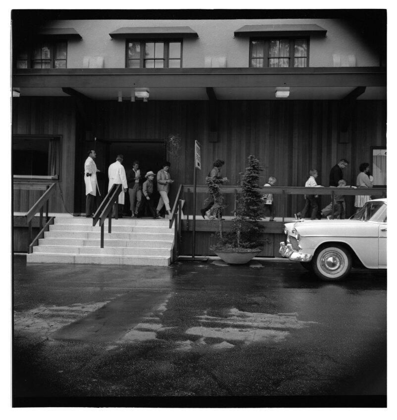 Negative, sheet film. 2 x 2 b&w. No. 914. OB Corp TV. Tourists at Olympia brewery. No ID on people