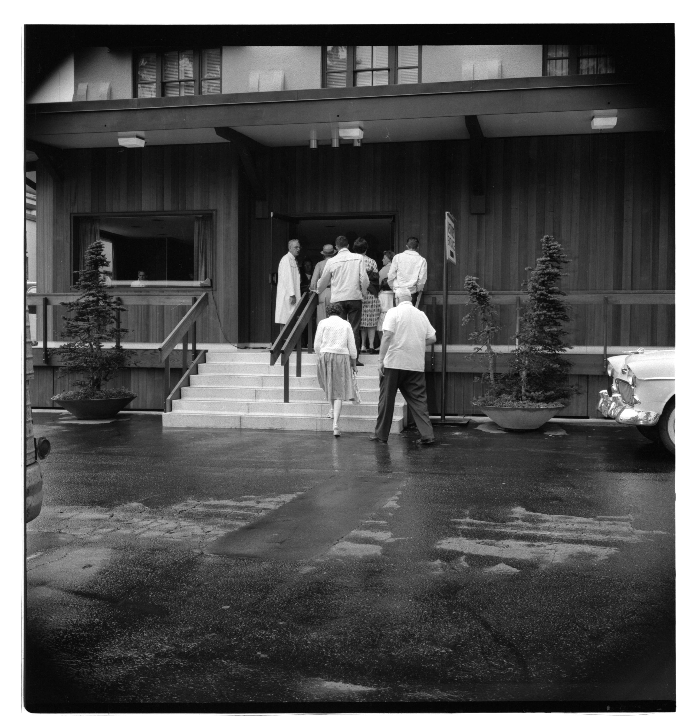 Negative, sheet film. 2 x 2 b&w. No. 914. OB Corp TV. Tourists at Olympia brewery. No ID on people