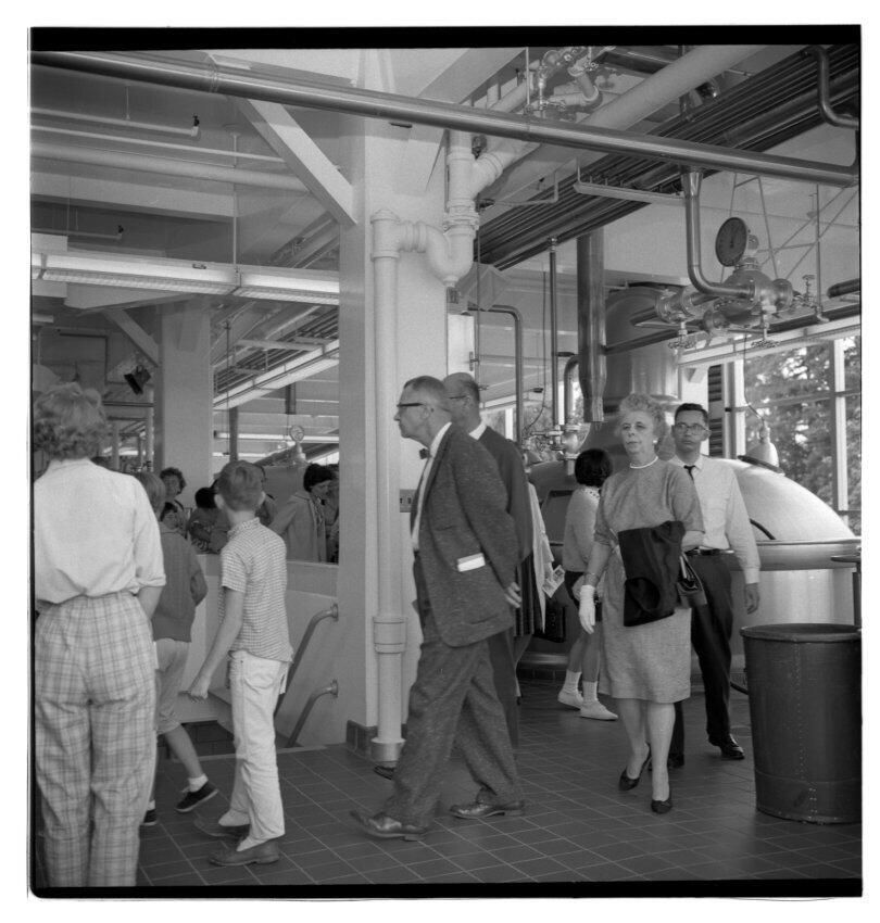 Negative, sheet film. 2 x 2 b&w. No. 914. OB Corp TV. Tourists at Olympia brewery. No ID on people