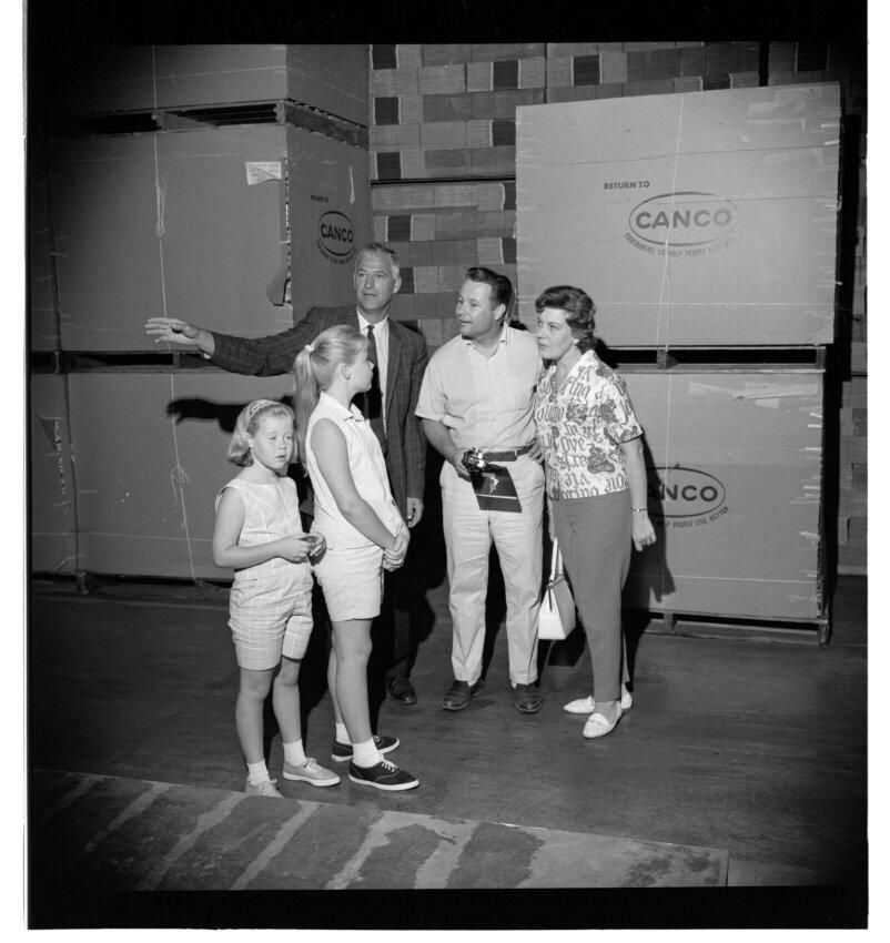 Negative, sheet film. 2 x 2 b&w. No. 914. OB Corp TV. Millionth visitor at Olympia brewery, 12:58 p.m. Lori, Donna, Eric and Lila Nelson. No ID on other