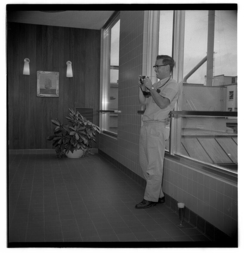 Negative, sheet film. 2 x 2 b&w. No. 914. OB Corp TV. Tourists at Olympia brewery. No ID