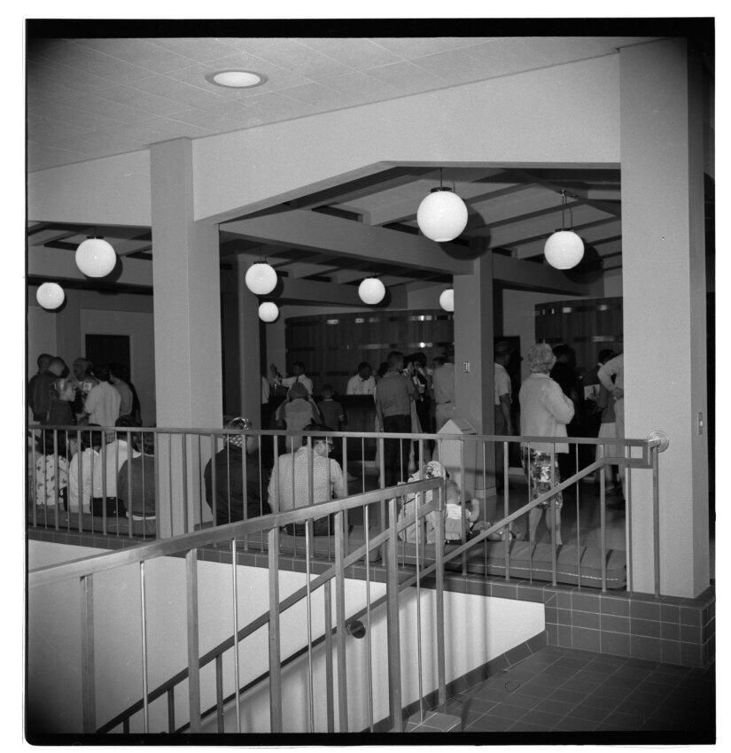Negative, sheet film. 2 x 2 b&w. No. 914. OB Corp TV. Tourists at Olympia brewery. No ID on people