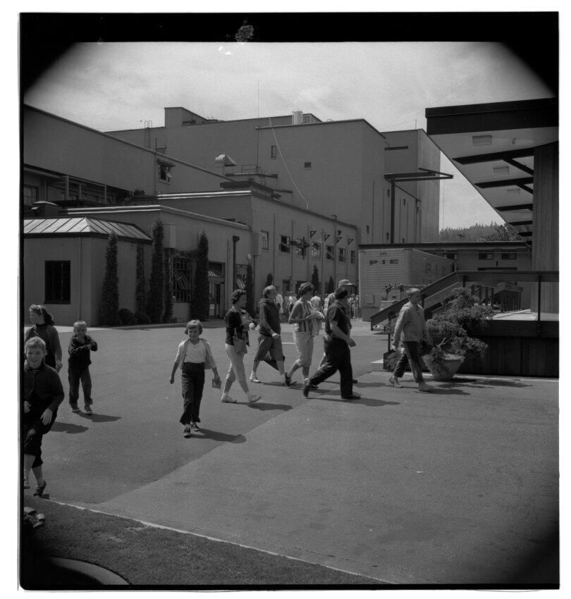 Negative, sheet film. 2 x 2 b&w. No. 914. OB Corp TV. Tourists at Olympia brewery. No ID on people
