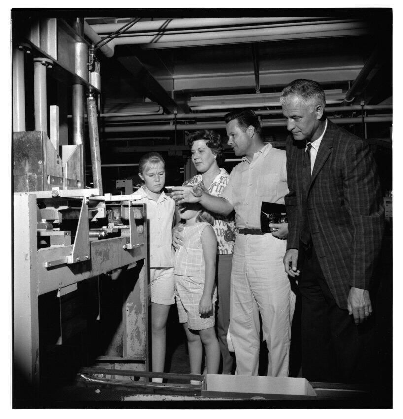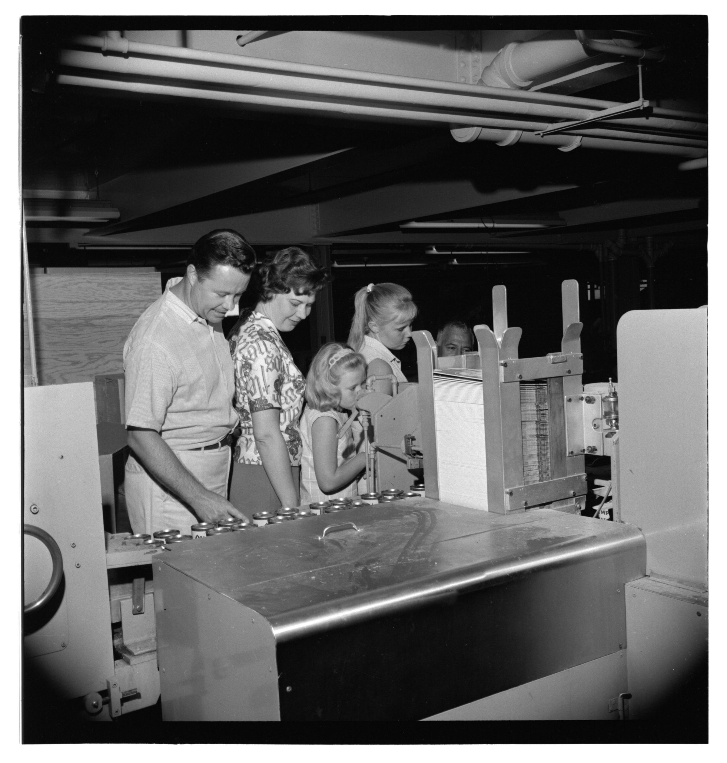 Negative, sheet film. 2 x 2 b&w. No. 914. OB Corp TV. Millionth visitor at Olympia brewery, 12:58 p.m. Donna, Lori, Lila and Eric Nelson. No ID on other