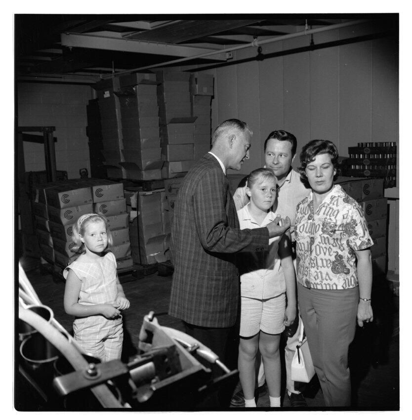 Negative, sheet film. 2 x 2 b&w. No. 914. OB Corp TV. Millionth visitor. 12:58 p.m.Millionth visitor at Olympia brewery, 12:58 p.m. Lori, Donna, Eric and Lila Nelson. No ID on other