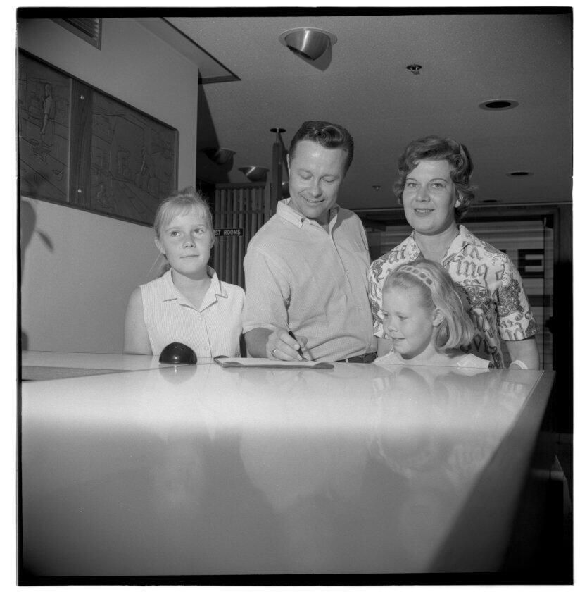 Negative, sheet film. 2 x 2 b&w. No. 914. OB Corp TV. Millionth visitor at Olympia brewery, 12:58 p.m. Donna, Eric, Lori and Lila Nelson.