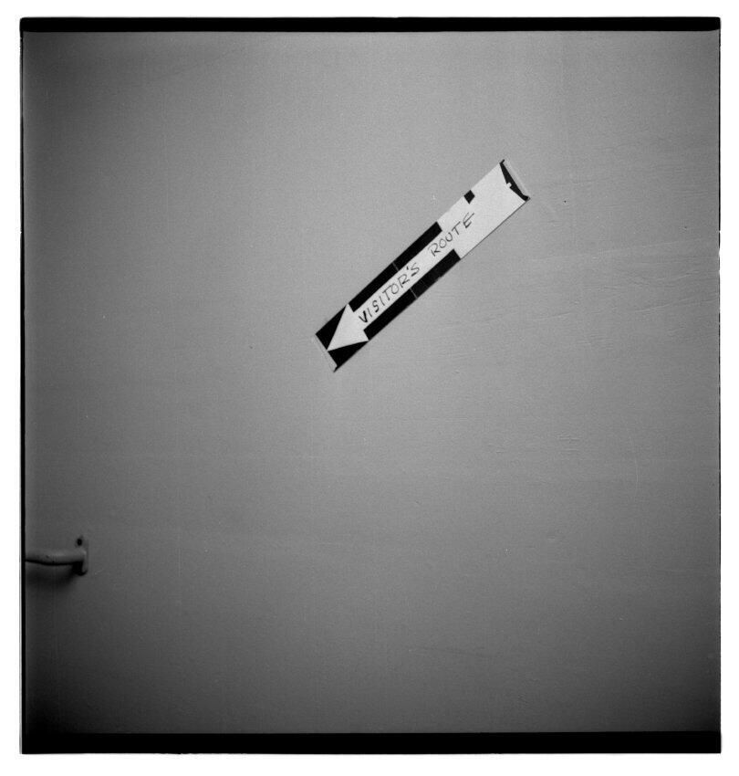 Negative, sheet film. 2 x 2 b&w. No. 914. OB Corp TV. Sign in visitor center at Olympia brewery.