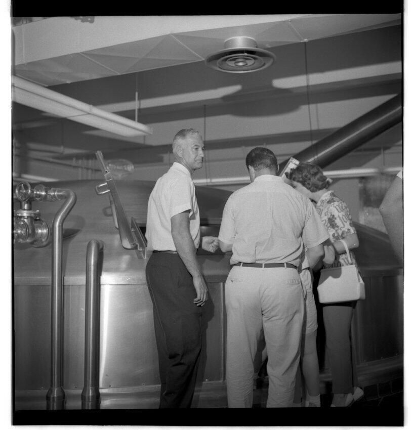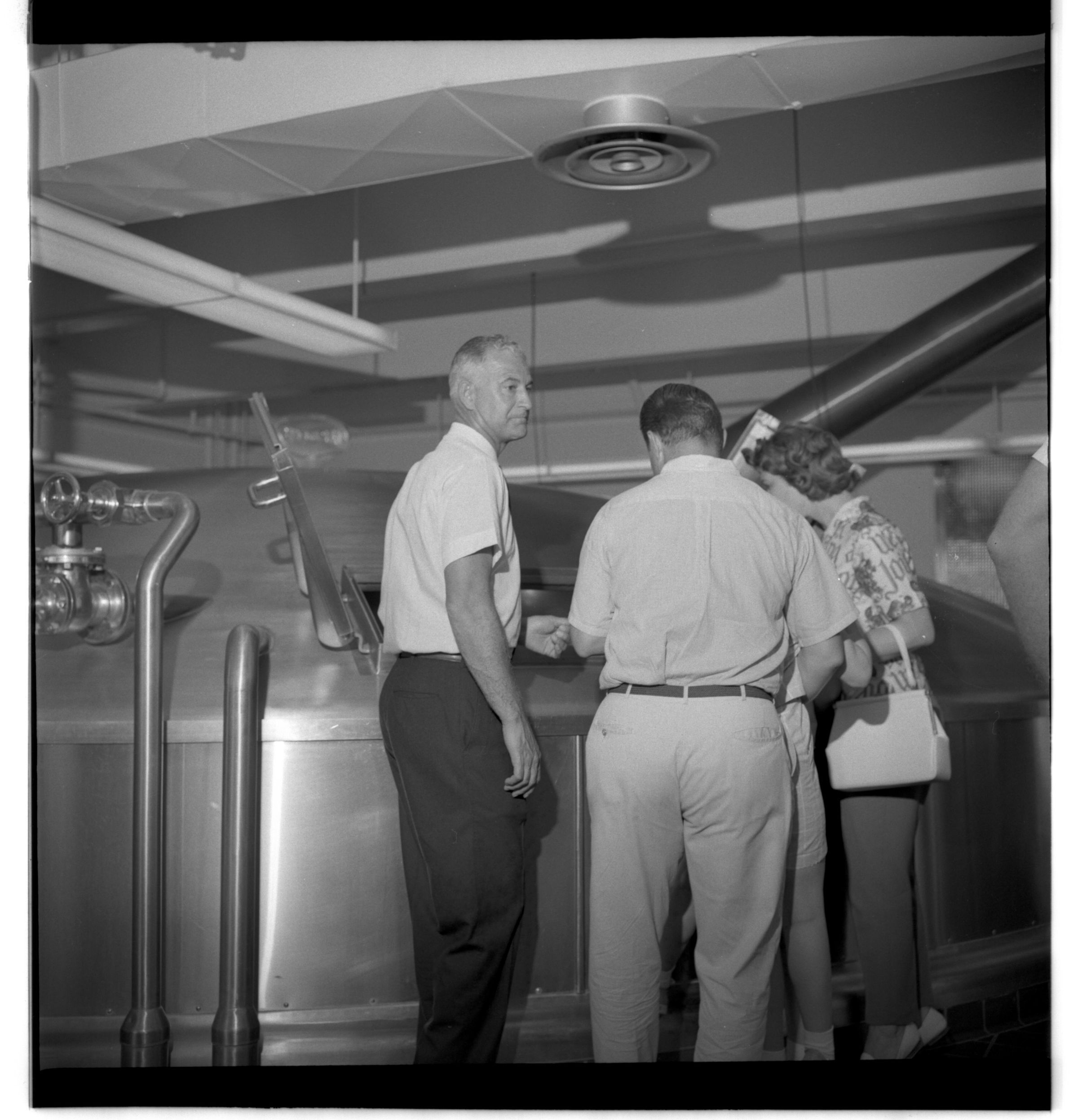 Negative, sheet film. 2 x 2 b&w. No. 914. OB Corp TV. Millionth visitor at Olympia brewery, 12:58 p.m. Lila and Eric Nelson. No ID on other