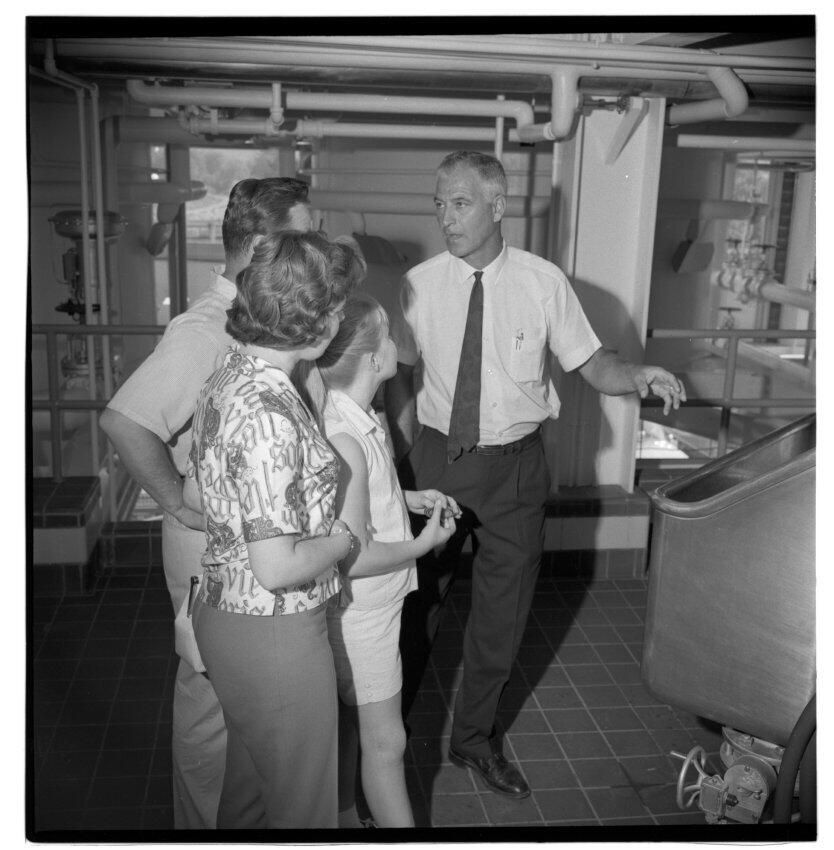 Negative, sheet film. 2 x 2 b&w. No. 914. OB Corp TV. Millionth visitor at Olympia brewery, 12:58 p.m. Lila, Eric and Donna Nelson. No ID on other