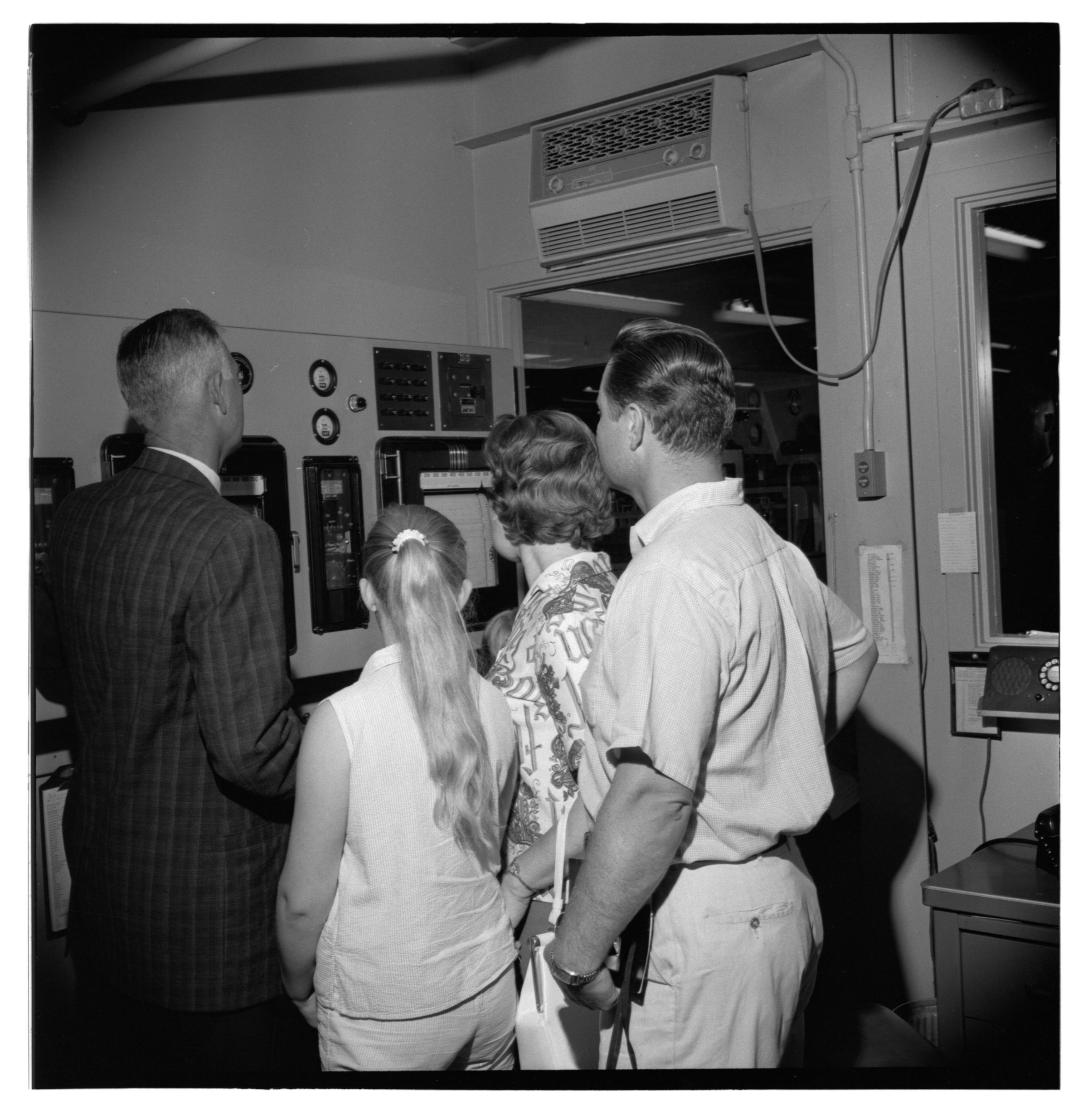 Negative, sheet film. 2 x 2 b&w. No. 914. OB Corp TV. Millionth visitor at Olympia brewery, 12:58 p.m. Donna, Lila and Eric Nelson. No ID on other