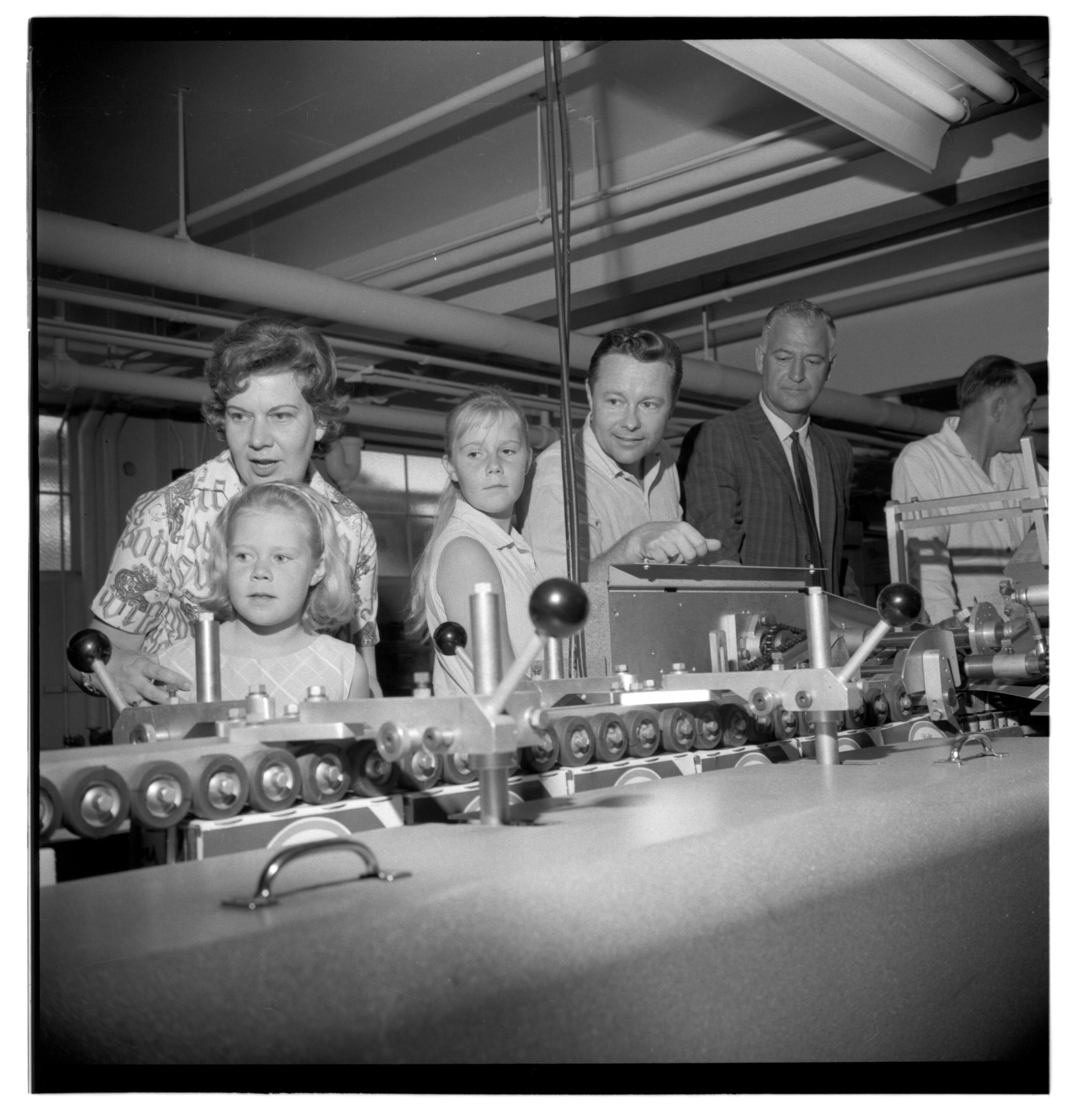 Negative, sheet film. 2 x 2 b&w. No. 914. OB Corp TV. Millionth visitor at Olympia brewery, 12:58 p.m. Lori, Lila, Donna and Eric Nelson. No ID on others
