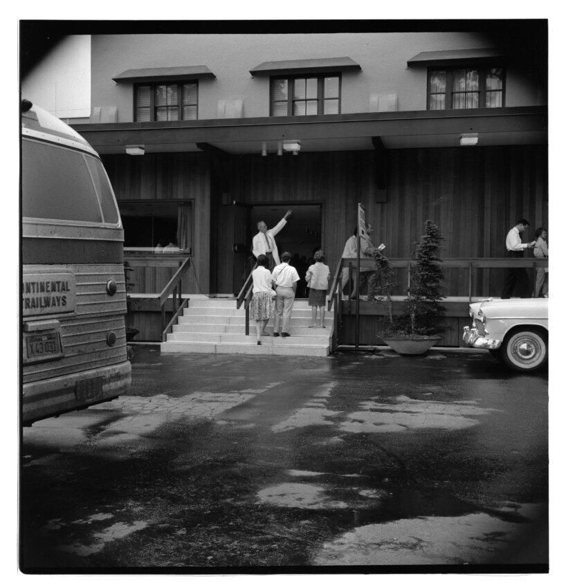 Negative, sheet film. 2 x 2 b&w. No. 914. OB Corp TV. Tourists at Olympia brewery. No ID on people