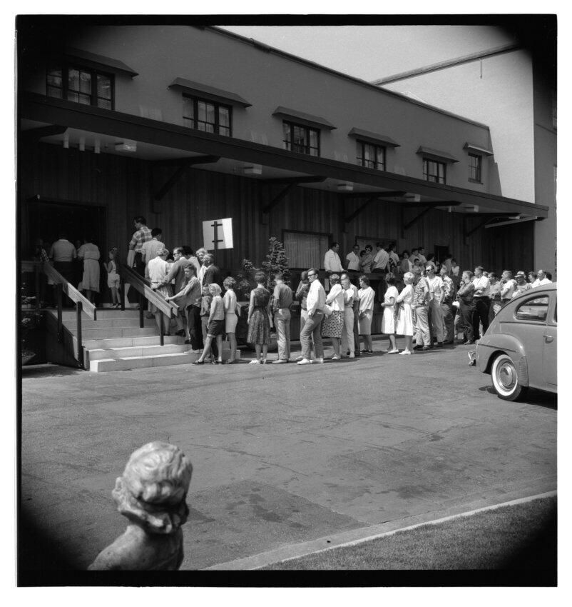 Negative, sheet film. 2 x 2 b&w. No. 914. OB Corp TV. Tourists at Olympia brewery. No ID on people