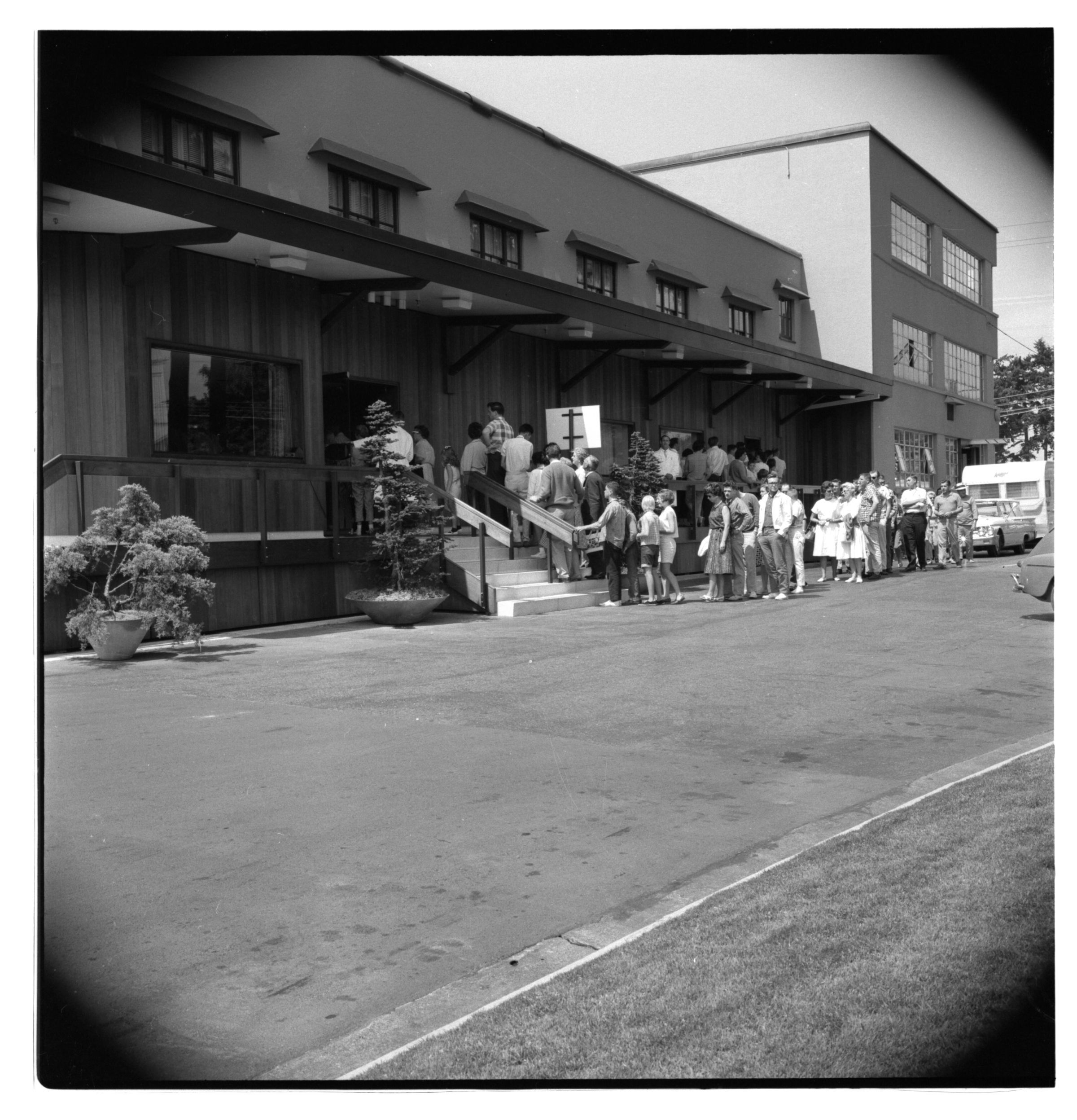 Negative, sheet film. 2 x 2 b&w. No. 914. OB Corp TV. Tourists at Olympia brewery. No ID on people
