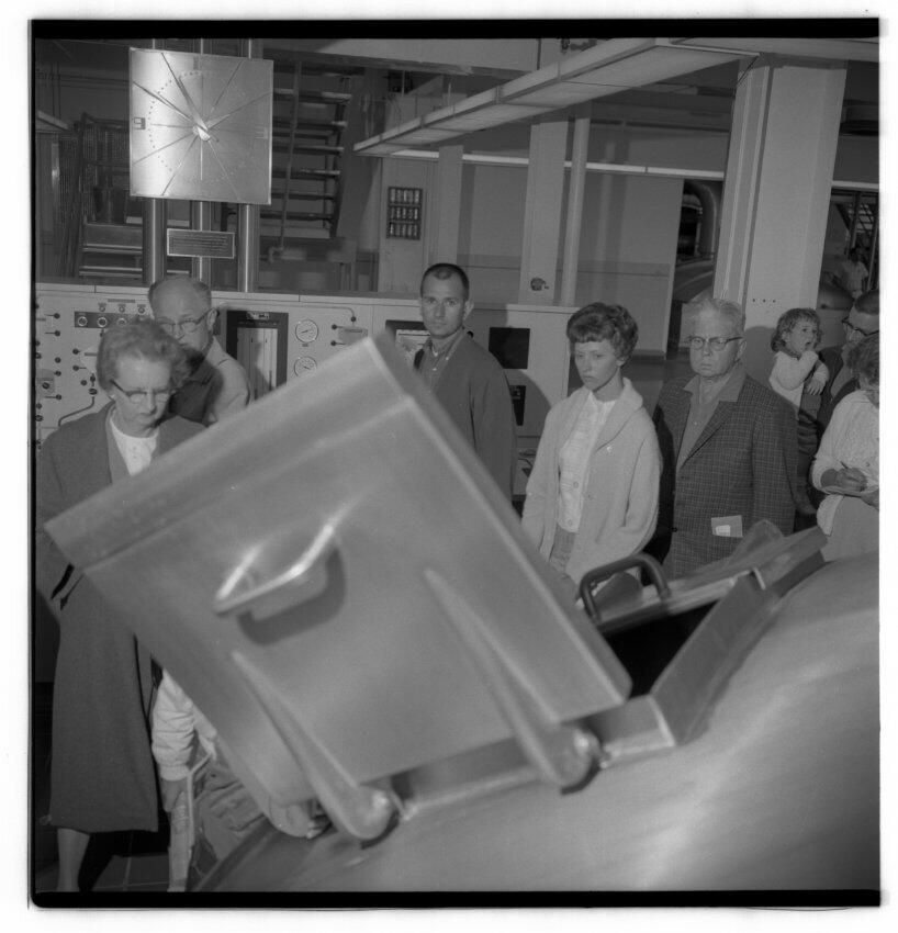 Negative, sheet film. 2 x 2 b&w. No. 914. OB Corp TV. Tourists at Olympia brewery. No ID on people