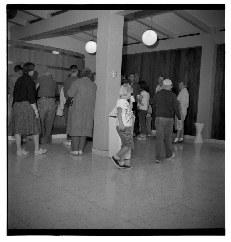 Negative, sheet film. 2 x 2 b&w. No. 914. OB Corp TV. Tourists at Olympia brewery. No ID on people
