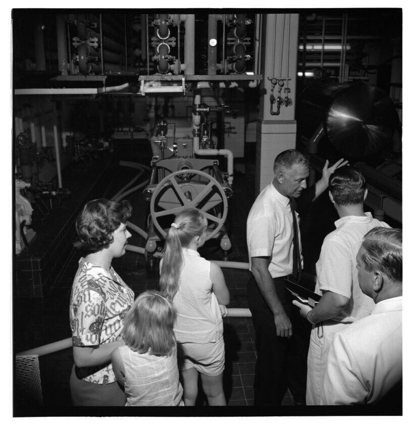 Negative, sheet film. 2 x 2 b&w. No. 914. OB Corp TV. Millionth visitor at Olympia brewery, 12:58 p.m. Lila, Lori, Donna and Eric Nelson. No ID on others