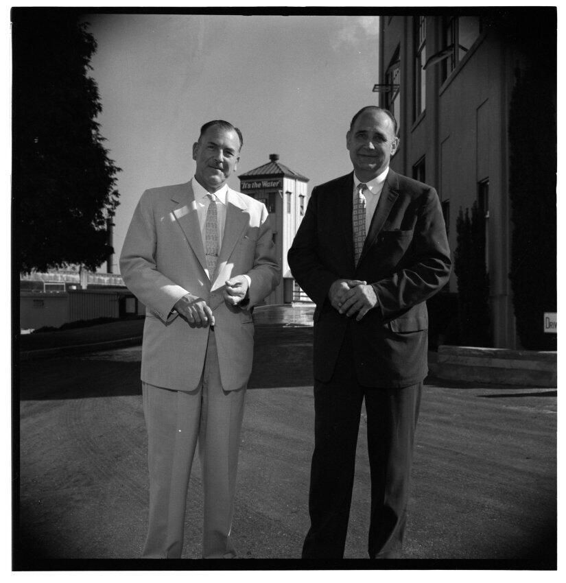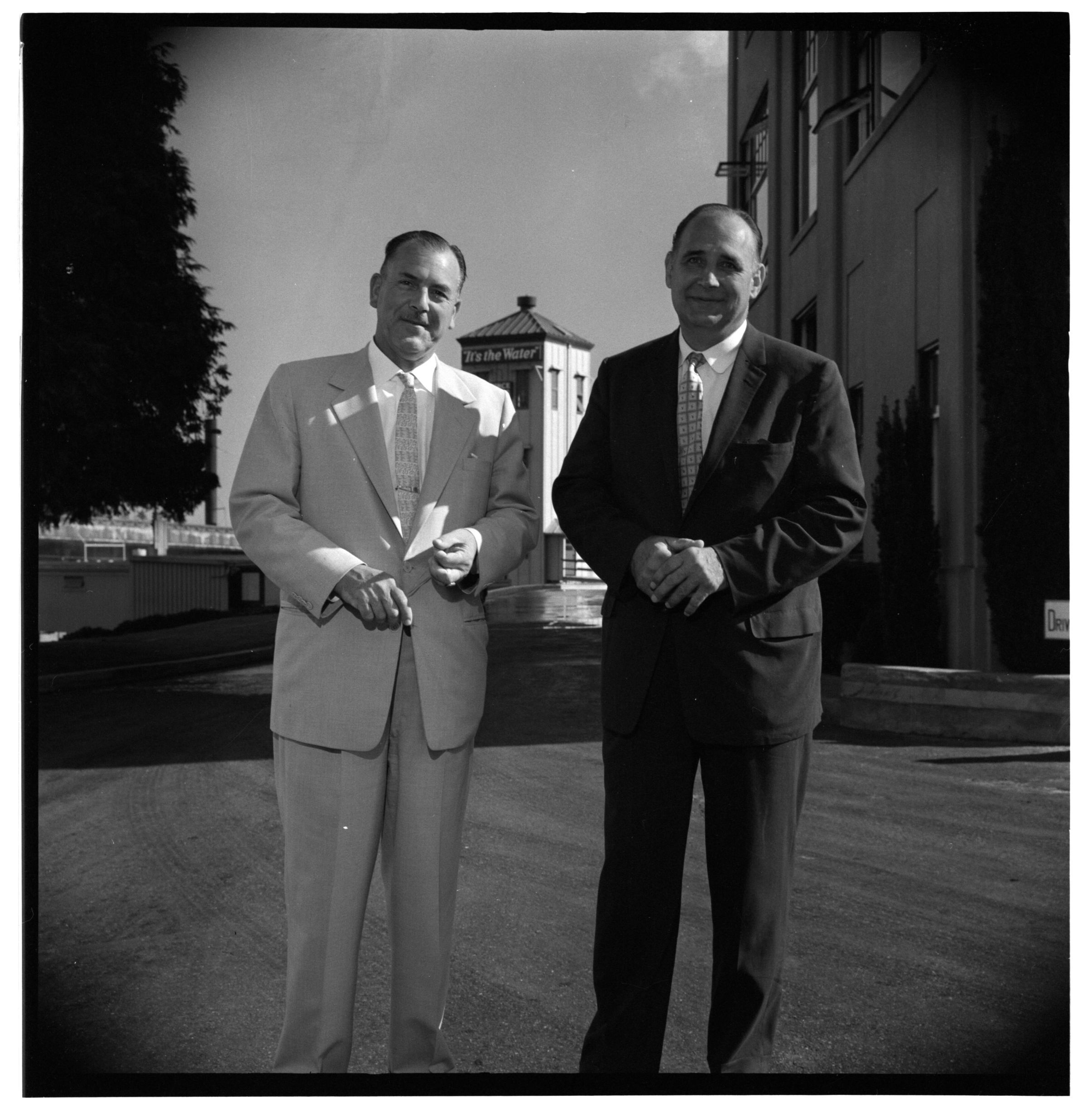 Negative, sheet film. 2 x 2 b&w. No. 587. OB Corp TV. Washington State Department of Fisheries head Milo Moore visits Olympia brewery. No ID on other.