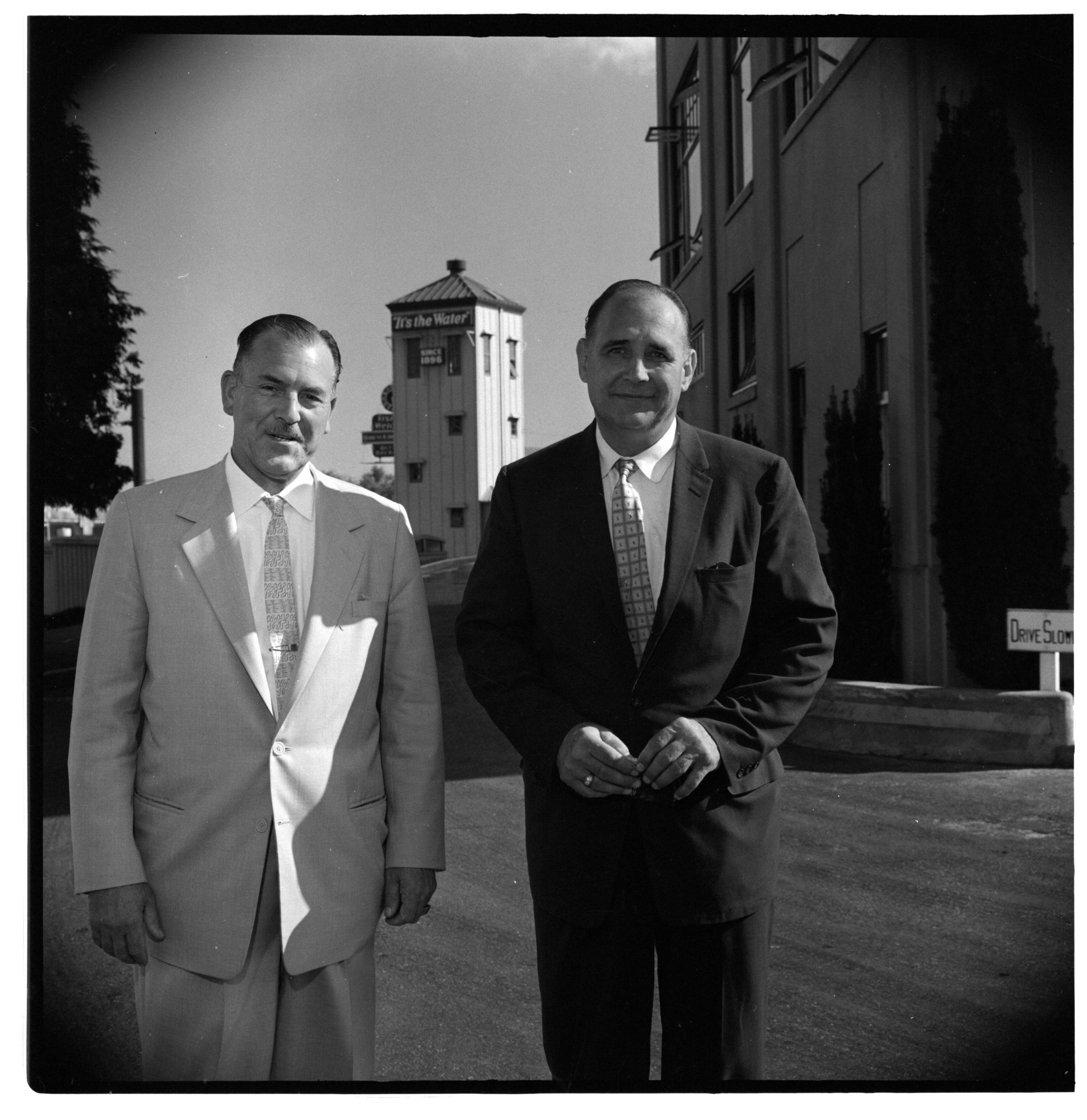 Negative, sheet film. 2 x 2 b&w. No. 587. OB Corp TV. Washington State Department of Fisheries head Milo Moore visits Olympia brewery. No ID on other.