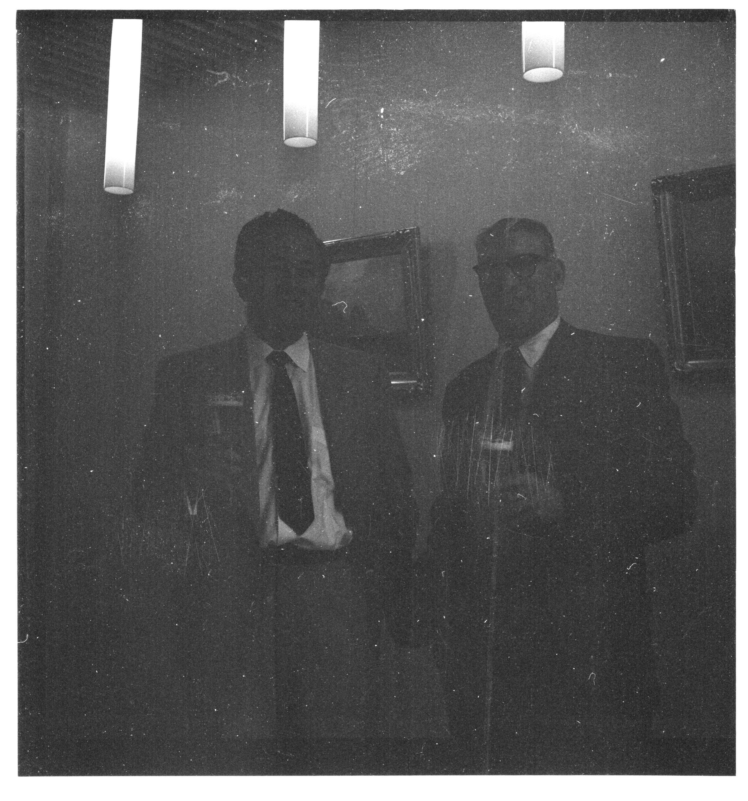 Negative, sheet film. 2 x 2 b&w. World Champion bridge player Don Oakie visits the Olympia brewery. No ID on man on left.