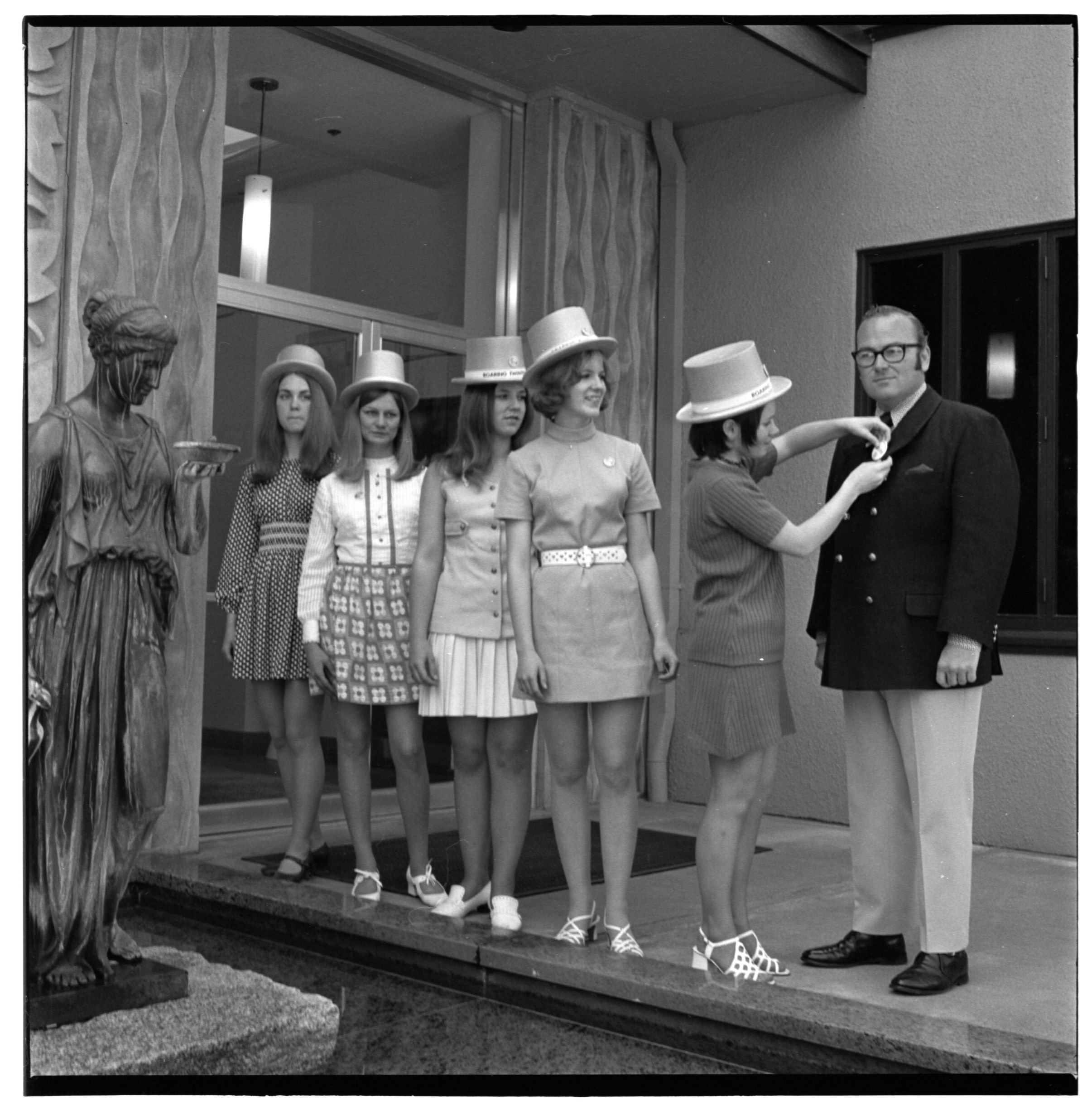 Negative, sheet film. 2 x 2 b&w. No. 1427. OB Corp TV. Port Townsend Princesses visit the Olympia brewery. No ID on man.