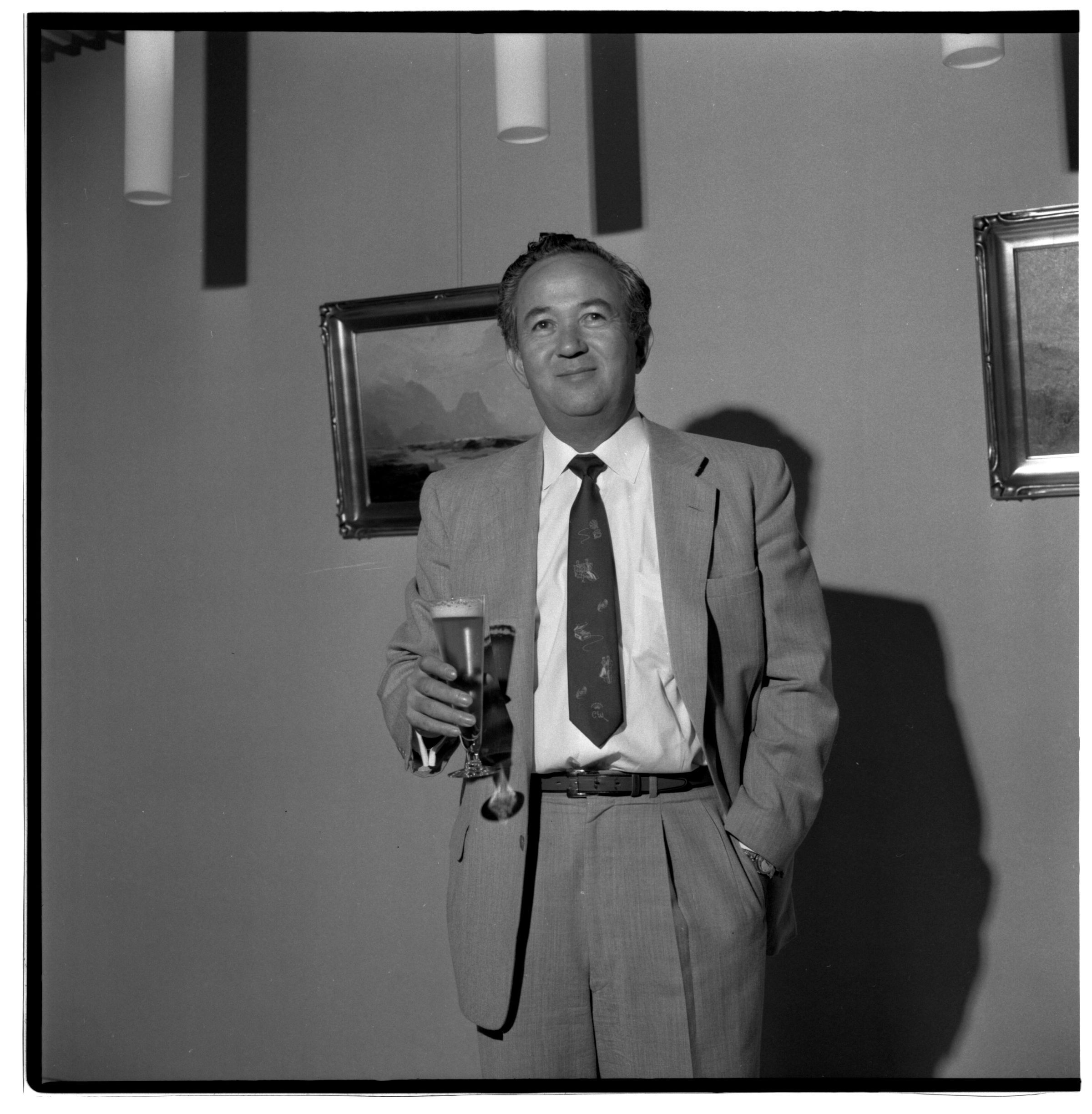 Negative, sheet film. 2 x 2 b&w. World Champion bridge player Don Oakie visits the Olympia brewery.