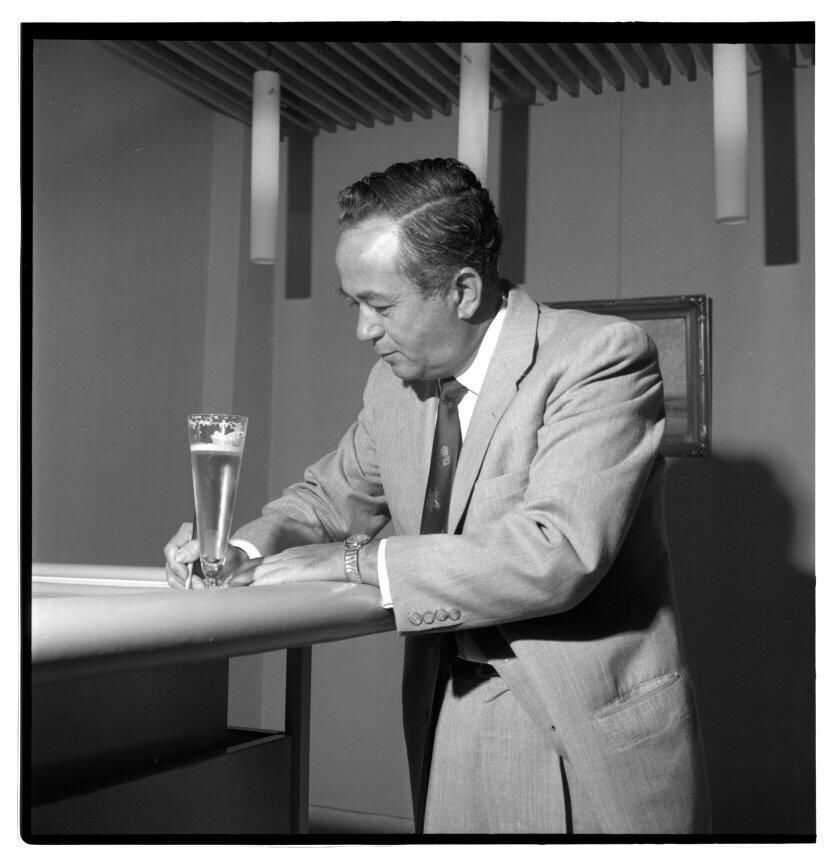Negative, sheet film. 2 x 2 b&w. World Champion bridge player Don Oakie visits the Olympia brewery.