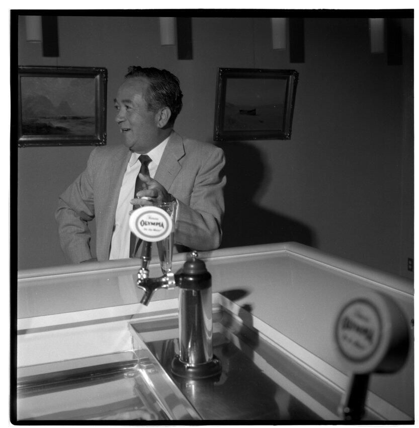 Negative, sheet film. 2 x 2 b&w. World Champion bridge player Don Oakie visits the Olympia brewery.