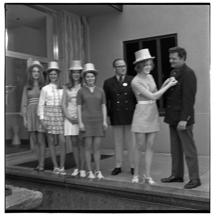 Negative, sheet film. 2 x 2 b&w. No. 1427. OB Corp TV. Port Townsend Princesses visit the Olympia brewery. No ID on men.