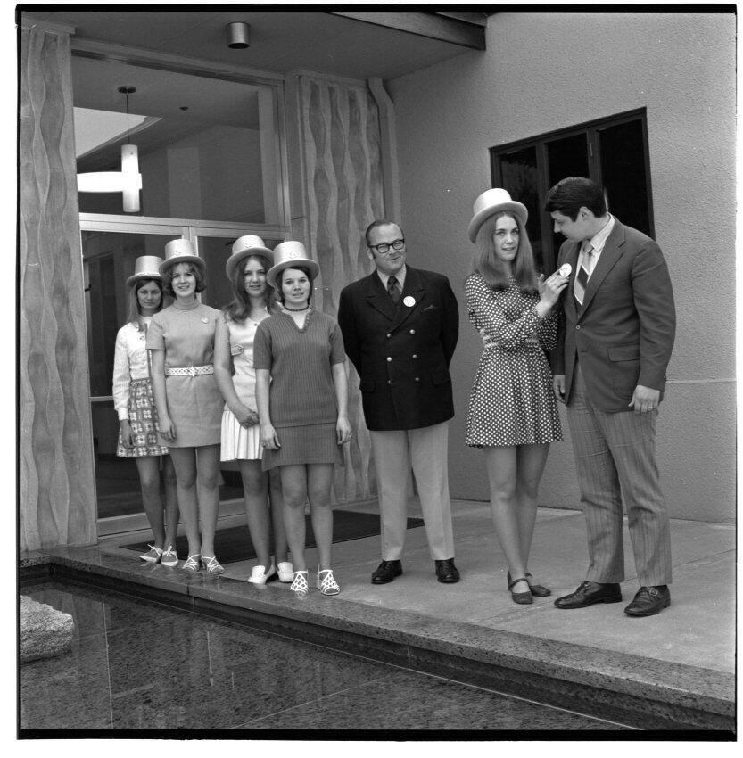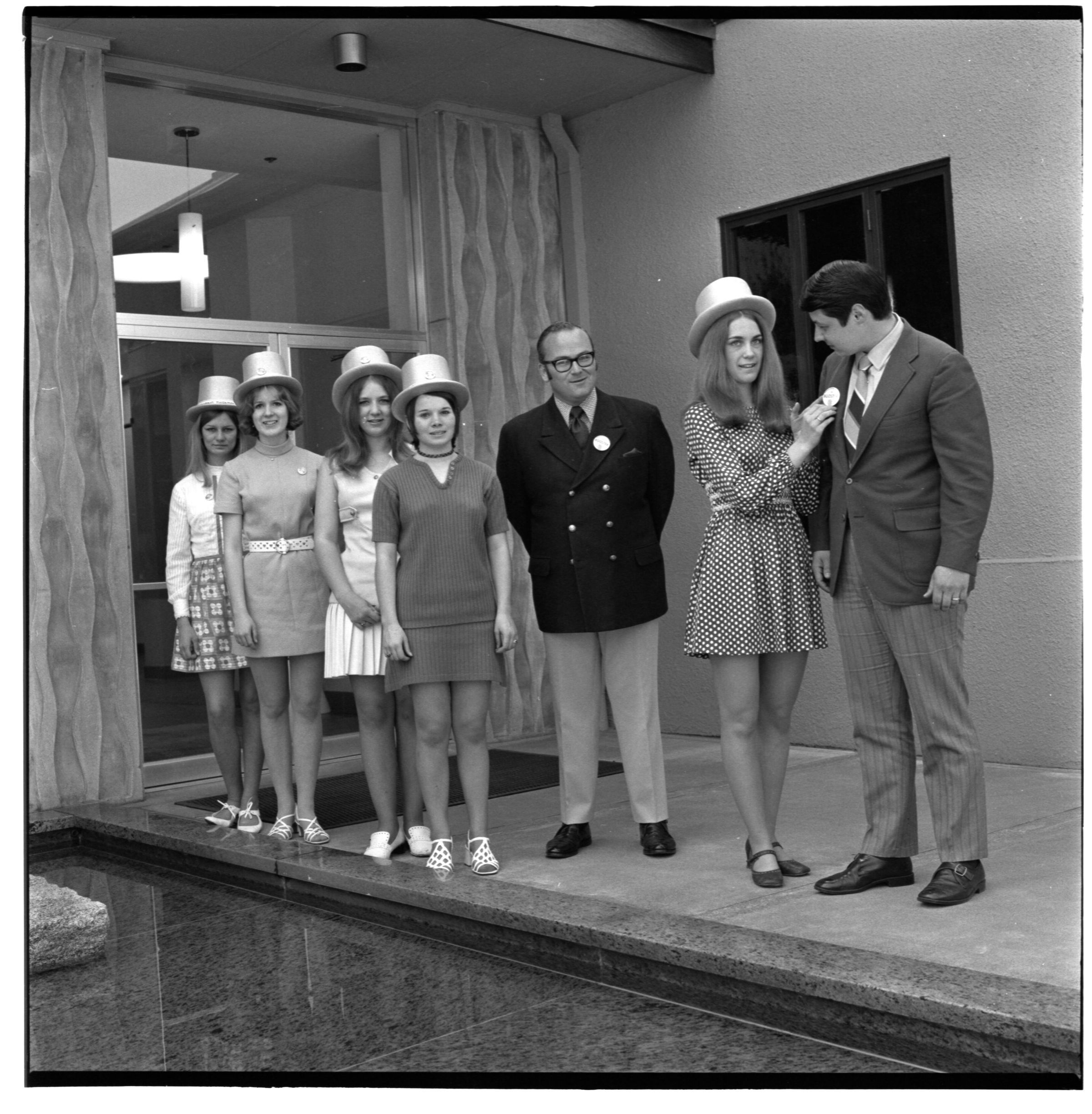 Negative, sheet film. 2 x 2 b&w. No. 1427. OB Corp TV. Port Townsend Princesses visit the Olympia brewery. No ID on men.